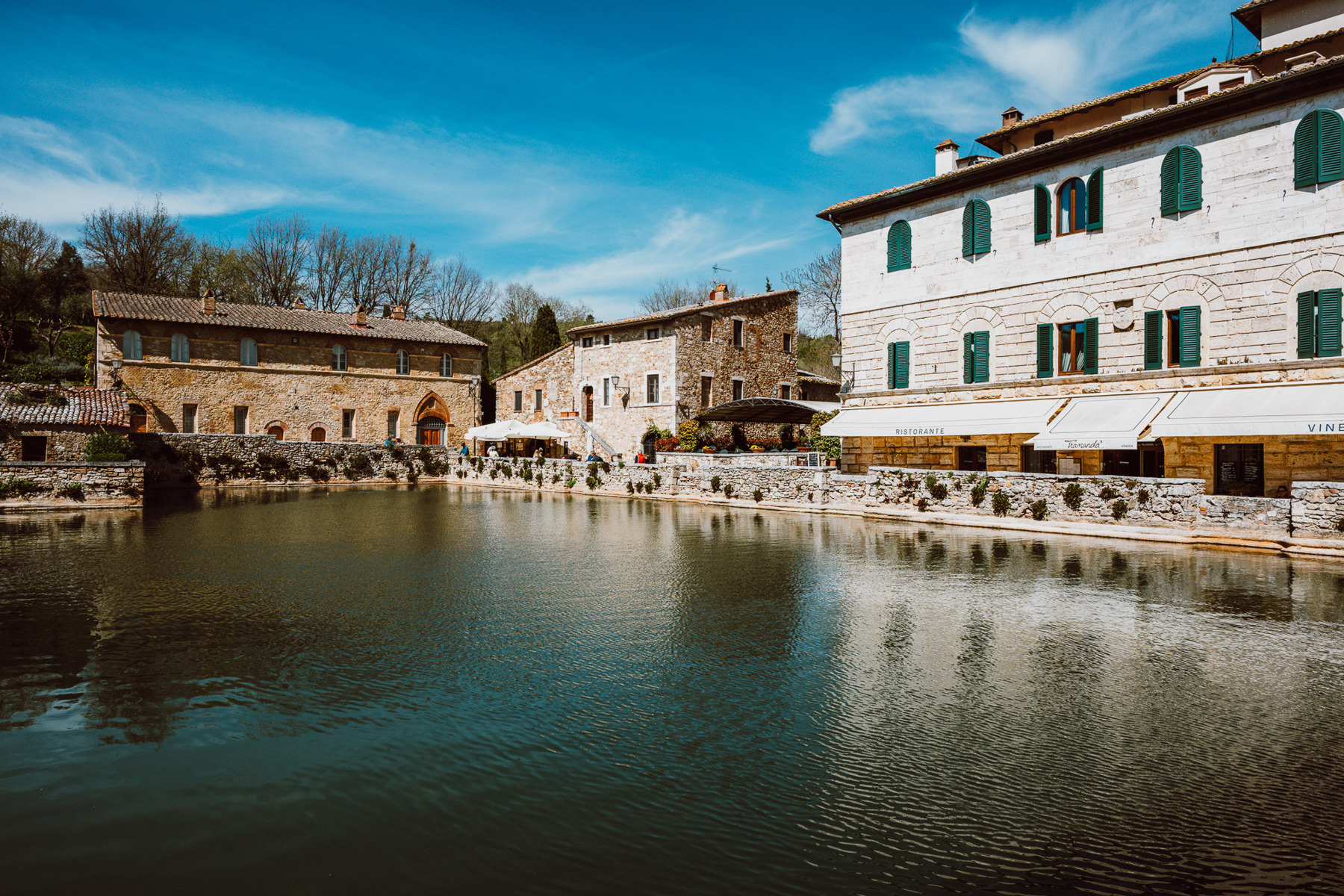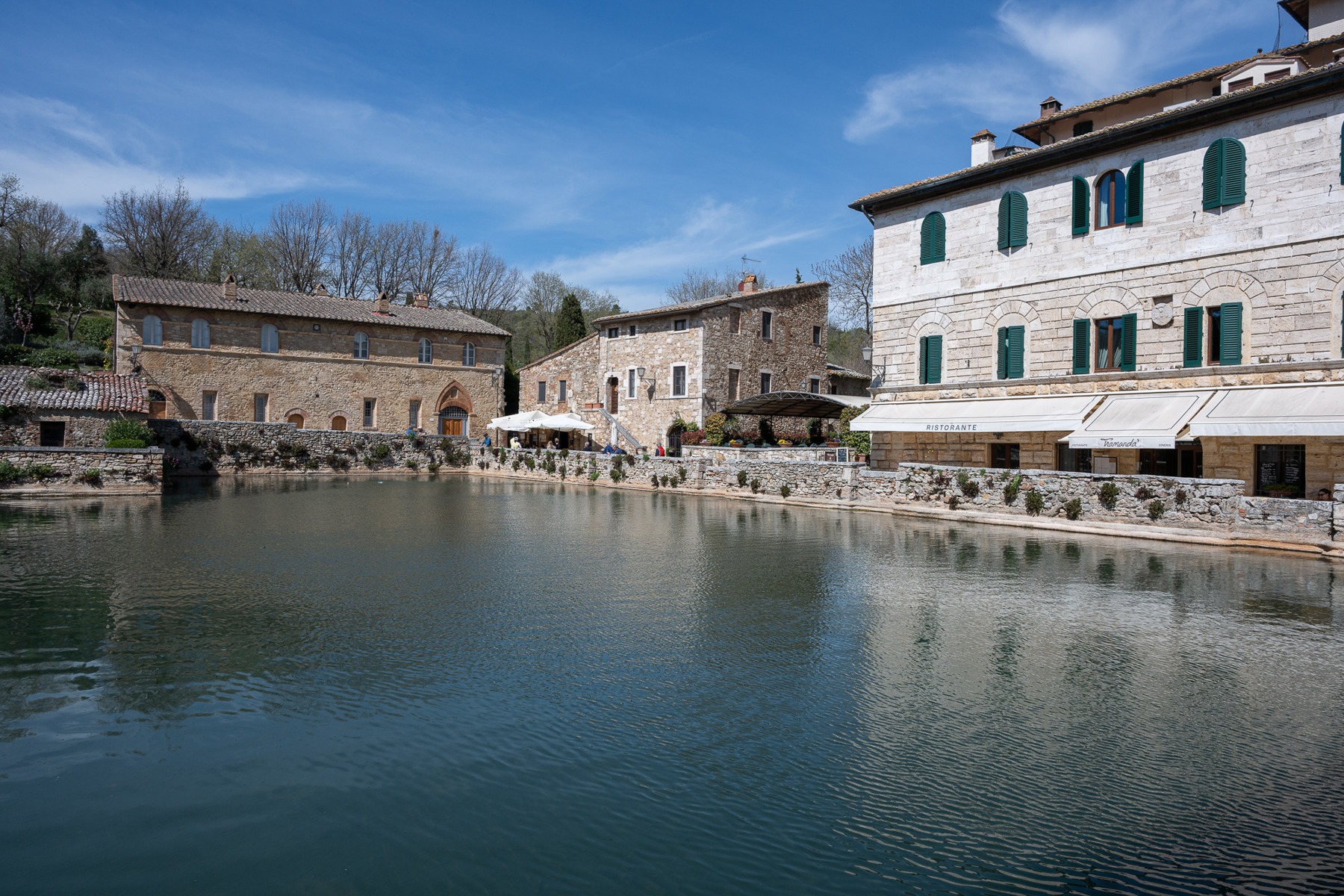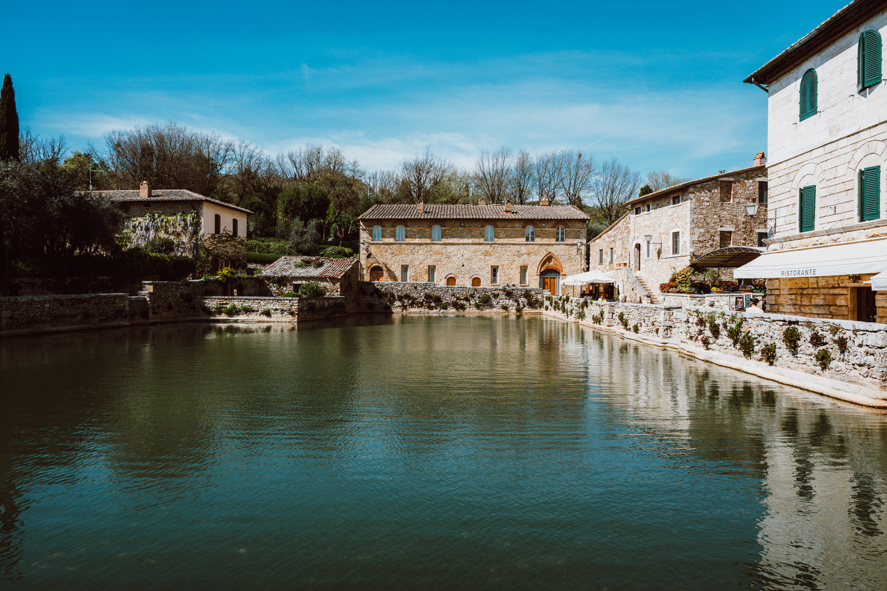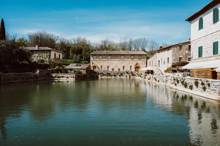 Besonders eindrücklich ist der Ort am frühen Morgen oder gegen Abend. Dann verliert das Licht seine Härte, die Mauern werden weicher, und der Dampf steigt langsam aus dem Becken auf. Visit Tuscany beschreibt genau diesen Moment, wenn bei Sonnenuntergang die Wasserdämpfe aufsteigen und die Steinränder des Beckens umhüllen. Für die Kamera entsteht daraus eine Stimmung, die nicht inszeniert werden muss – sie ist einfach da.