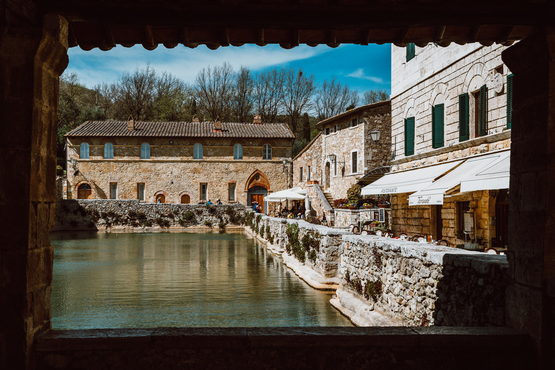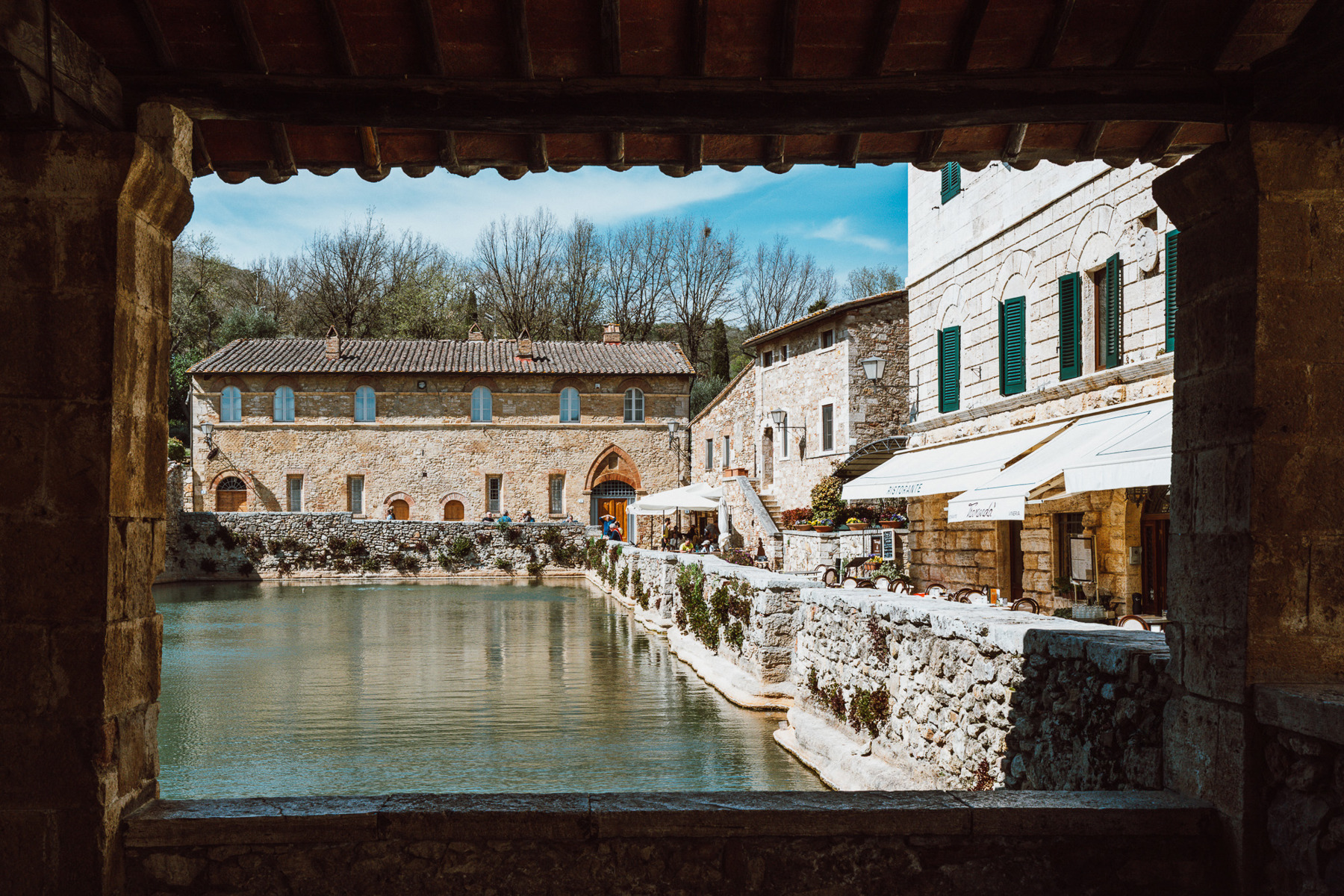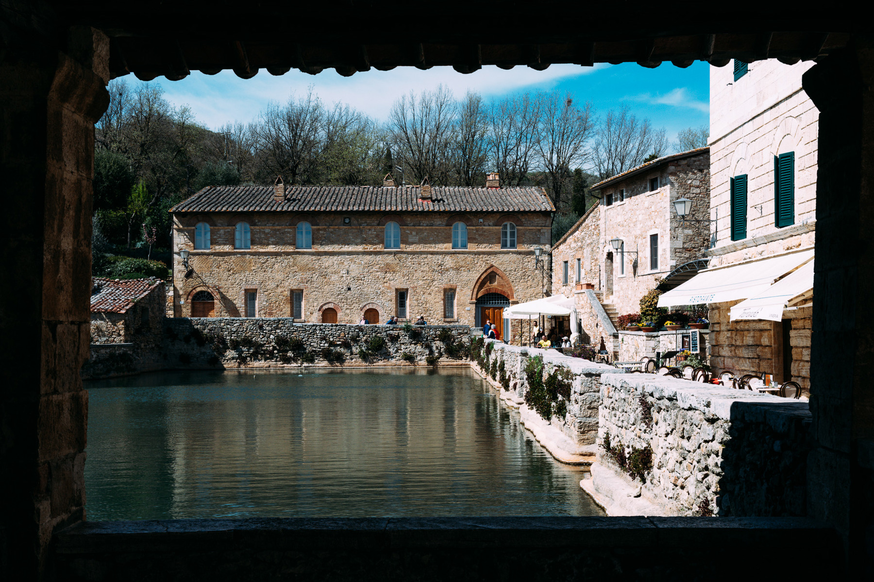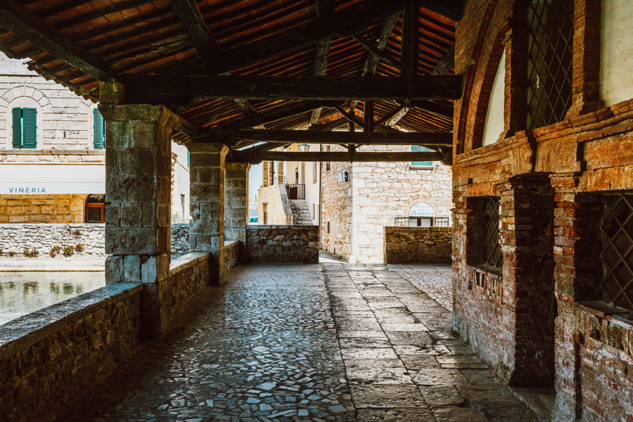 Die Fotos dieser Galerie suchen genau diese Verbindung aus Schönheit und Gebrauch, aus Poesie und Alltag. Bagno Vignoni ist nicht nur malerisch, weil es alt ist. Es ist malerisch, weil man spürt, dass jedes Element einen Zweck hatte: die Quelle, das Becken, die Kanäle, die Mühlen, die Mauern, die Loggien. Aus dieser Zweckmässigkeit ist ein Ort entstanden, der heute beinahe traumhaft wirkt.