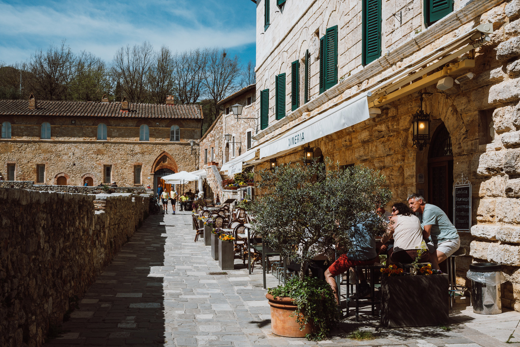 In dieser Galerie geht es deshalb weniger um die Dokumentation eines Dorfes als um das Festhalten einer Stimmung. Bagno Vignoni wirkt wie ein Ort zwischen den Zeiten. Die Menschen kommen und gehen, sitzen kurz an einem Tisch, treten an die Mauer des Beckens, schauen hinein, machen ein Foto, schweigen einen Moment. Und doch scheint der eigentliche Rhythmus nicht von den Besuchern zu kommen, sondern vom Wasser selbst.