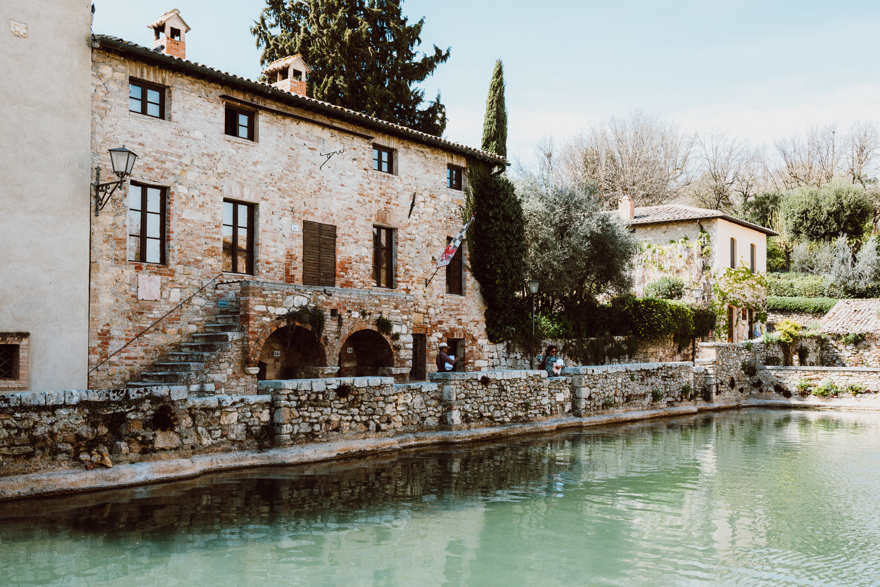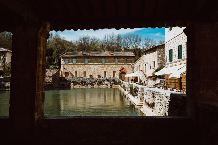 Besonders eindrücklich ist der Ort am frühen Morgen oder gegen Abend. Dann verliert das Licht seine Härte, die Mauern werden weicher, und der Dampf steigt langsam aus dem Becken auf. Visit Tuscany beschreibt genau diesen Moment, wenn bei Sonnenuntergang die Wasserdämpfe aufsteigen und die Steinränder des Beckens umhüllen. Für die Kamera entsteht daraus eine Stimmung, die nicht inszeniert werden muss – sie ist einfach da.